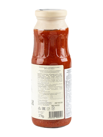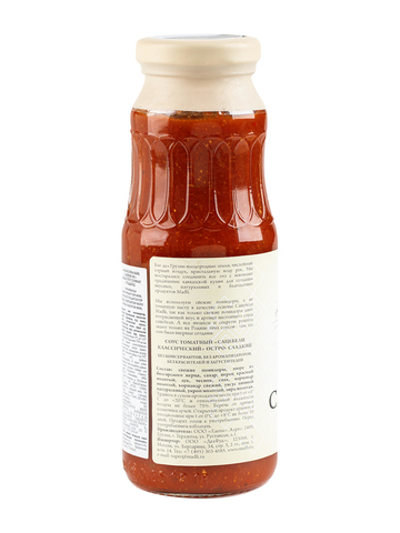 Состав: свежие помидоры, пюре из болгарского перца, чеснок свежий, соль морская, лук, сахар, кориандр молотый, кориандр свежий, укроп молотый, уксус винный натуральный, зира молотая, перец красный молотый.